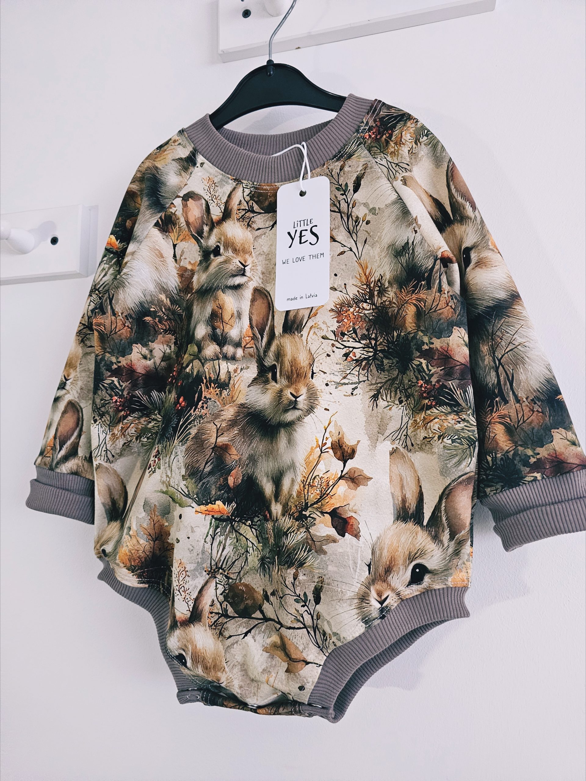 Brīnišķīgs romperis mazuļiem ar zaķīšu printu. Piedurknēm manžetes ir pagarinātas kuras var  atlocīt, tādējādi pagarinot apģērba nēsāšanas laiku. Perfekta izvēle ikdienai un īpašiem mirkļiem. Šūta no augstas kvalitātes kokvilnas cilpiņtrikotāžas. Audums ir elastīgs, maigs, elpojošs un patīkams bērna ādai. Pieejams no 62-92 izmēram. Pasūtījumi ir gatavi izsūtīšanai 1 – 4 darba dienu laikā no pasūtījuma apmaksas brīža.